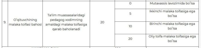 Unga ko’ra, pedagoglarga direktor jamgʻarmasidan toʻlab beriladigan ustamalar belgilashda malaka toifasi uchun qoʻshimcha ballar beriladi. Jumladan,